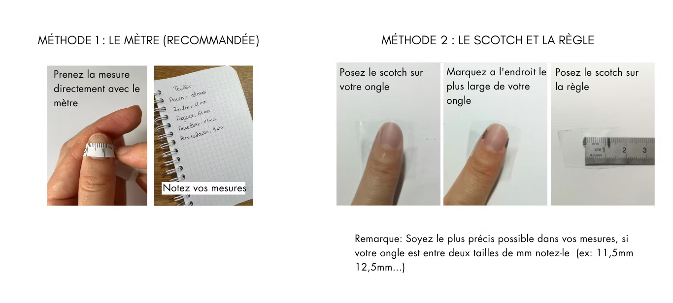 Les press on nails sont crées à la commande et sont fabriqués sur-mesure, c'est pourquoi il est important de connaître la mesure de vos ongles naturels avant de commander.