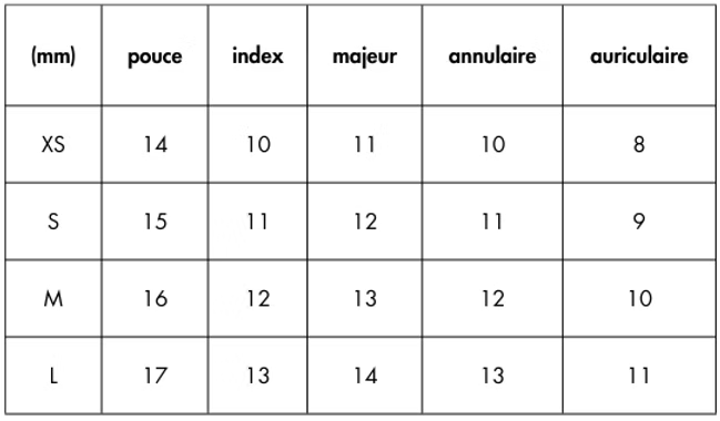 Remarque : Après avoir pris vos mesures d'ongles, vous pouvez les comparer avec ce tableau qui vous donnera une idée des mesures standard.